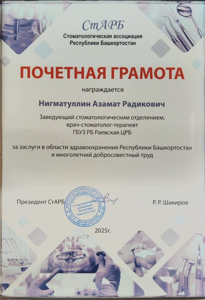 За его огромные заслуги в медицине и многолетний добросовестный труд Стоматологическая Ассоциация Республики Башкортостан вручила ему Почётную грамоту!