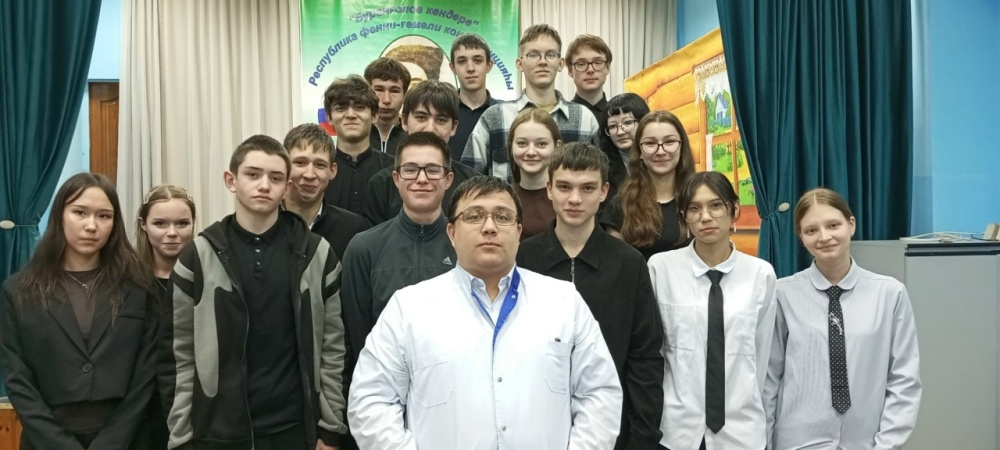 Перед школьниками выступил Арсен Альбертович Ибрагимов — заведующий детским поликлиническим отделением, врач-хирург Раевской ЦРБ. Он открыто поделился: как выбирал профессию, с какими трудностями столкнулся в учёбе и практике, и что вдохновляет его каждый день надевать белый халат.